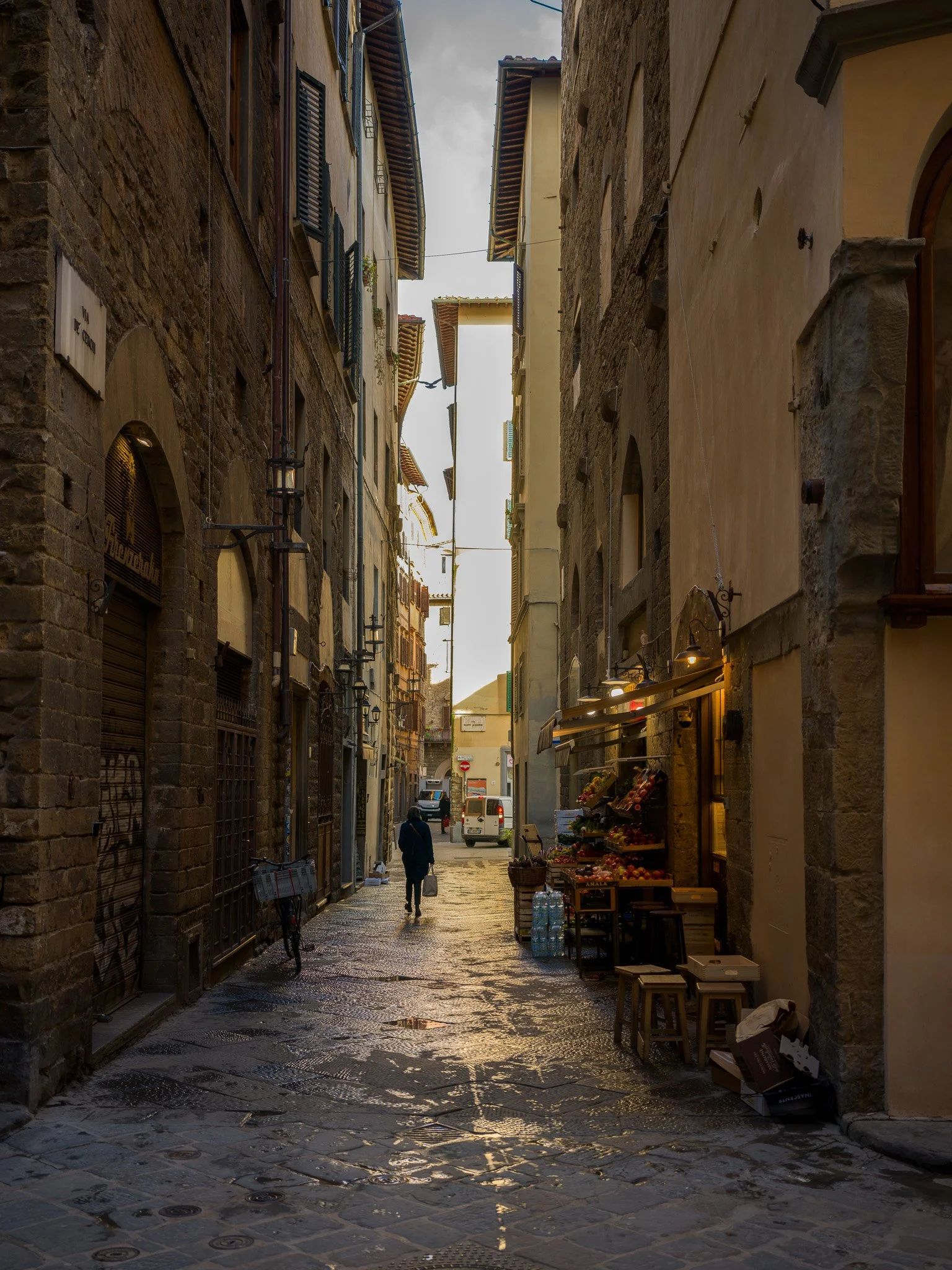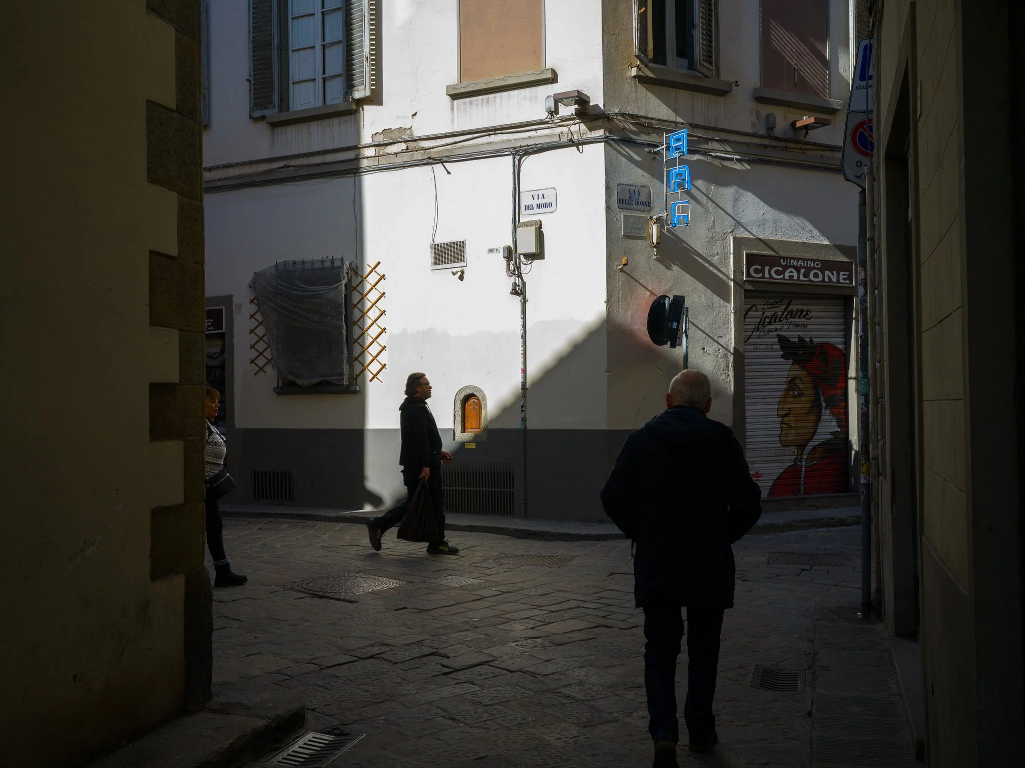 Old Florence, like many medieval European cities and villages, was built for human beings, horses, and carts. The ‘roads’ are little more than alleyways, with high walled living structures that rise three or four floors. They also have the added benefit of creating shade in the hot summers since the buildings are so close together, and this creates a photographer’s playground of shadow, chiaroscuro, and pops of color. Slivers of light illuminate pieces of wall or ground like a stage spotlight as they slice down a street. Human beings on their way to live their lives are cast in silhouette. I was mesmerized and really couldn’t get enough of it, and I meandered aimlessly. In hind sight, I see that I kind of made the same image over and over, but that’s how it goes when you’re a photographer and you start pulling on a visual thread.