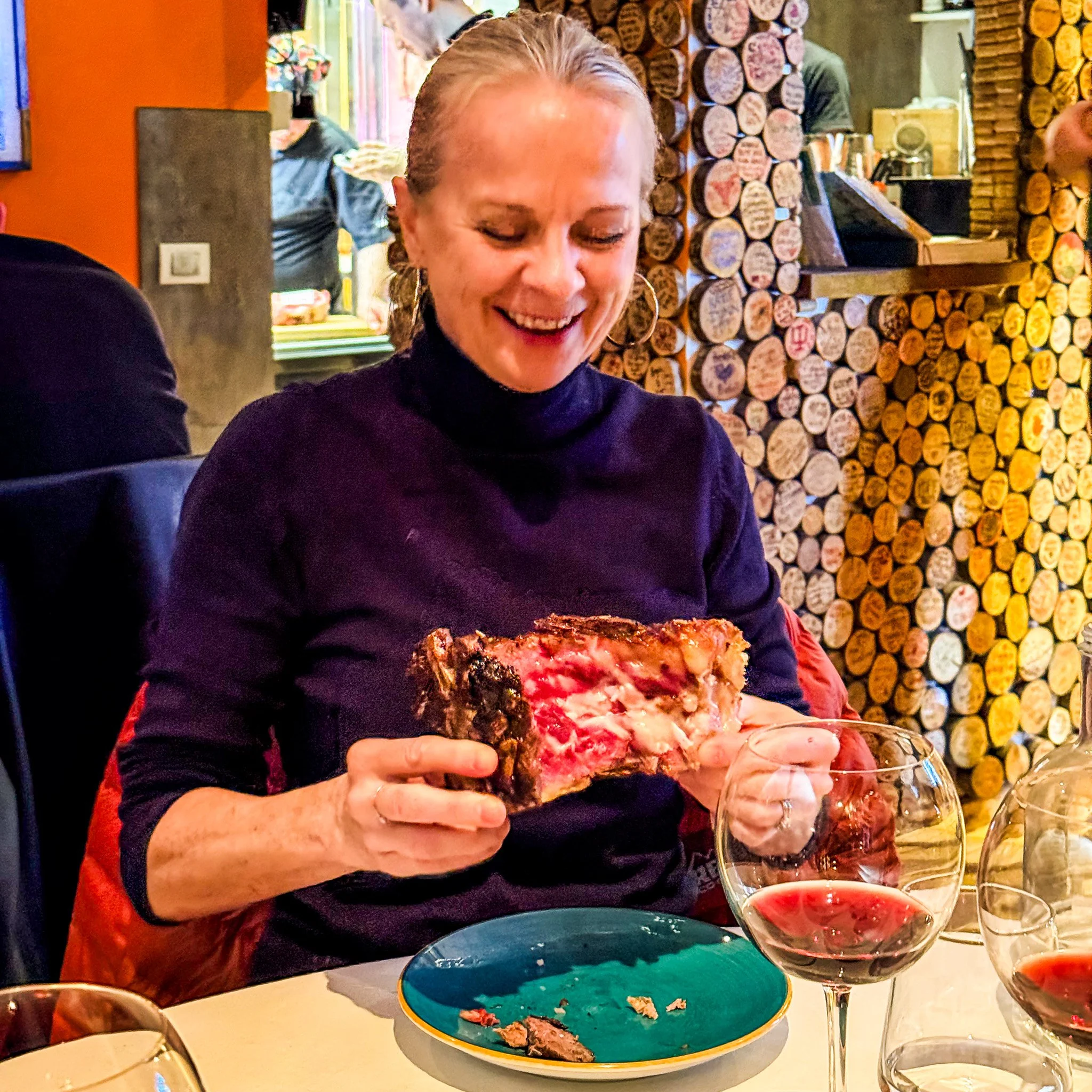 They received us warmly, as Italians always do. Dining out in Florence and being taken care of by animated, friendly restaurateurs is one of life’s great experiences. They treated me like they knew me because I had been in a few hours earlier making the reservation. The food was everything one hopes it will be—gnocchi, spinach, salads for starters, and then the main event, the steak. We had to decide how thick we wanted it and after forefingers and thumbs spread as wide possible, a massive chunk of wood fired meat arrived. They cut it up in front of us as we ogled it like a pack of circling hyenas before a fallen water buffalo. Paired with a couple of bottles of local Tuscan wines of quality, it was an intense experience and we could barely finish it. But Marie was not about to let the bone go unfinished. Also, the waiter taking care of us insisted that someone eat it, throwing down a gauntlet.