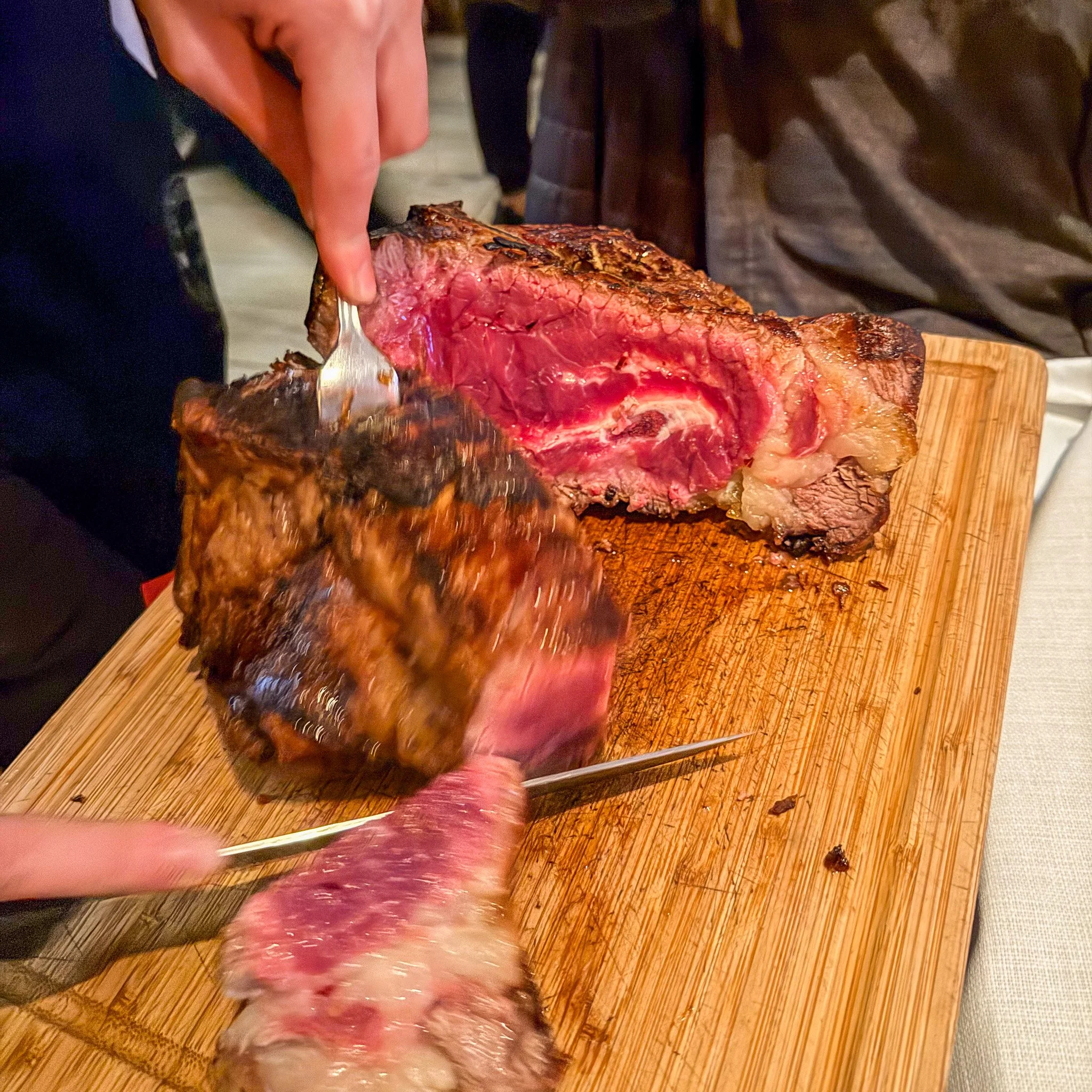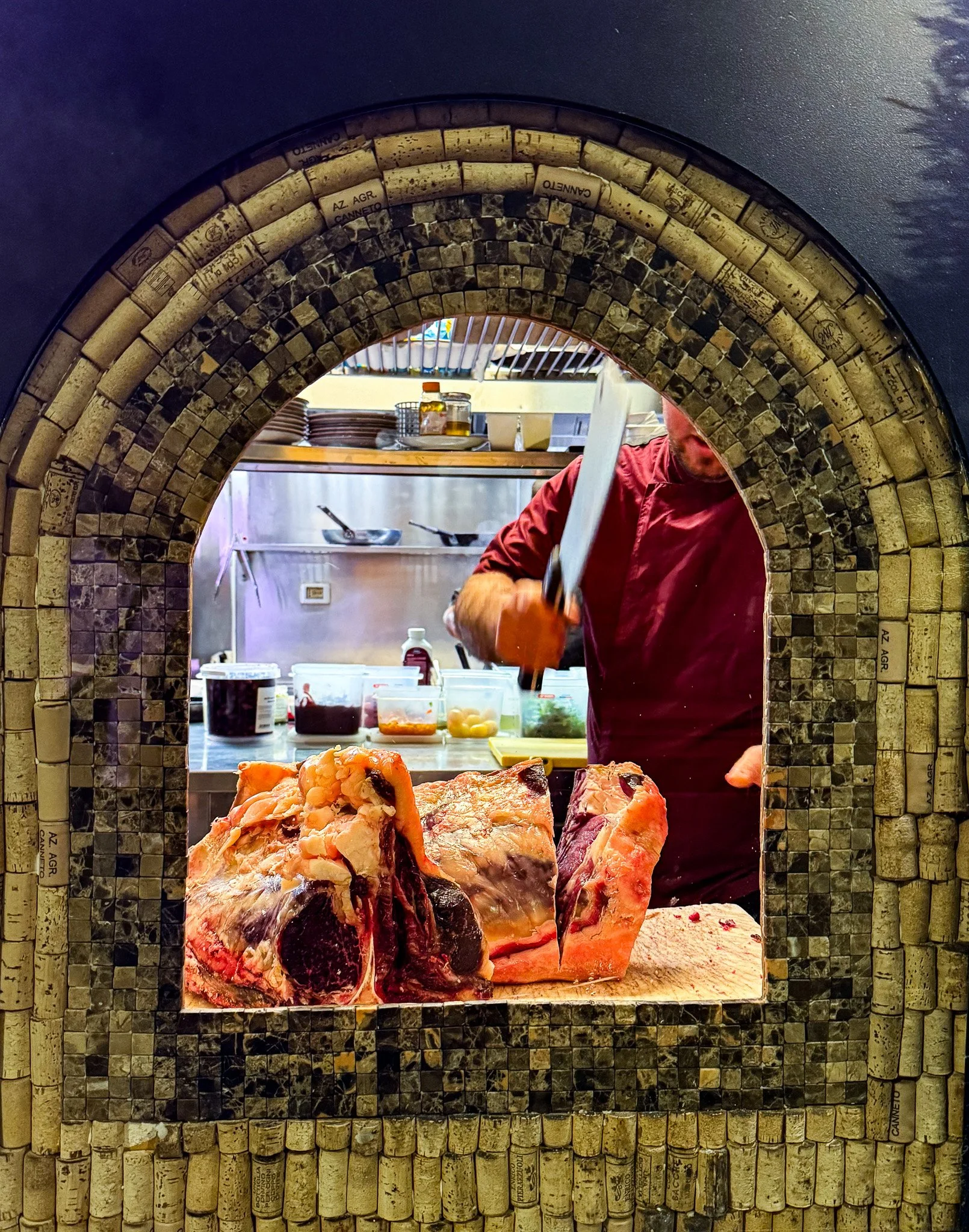 After the Uffizi, which was incredible despite our discreet juvenile behavior, we were all hungry. Earlier in the day when I was wondering around with my camera, I popped in and made a reservation at La Buchetta. It caught my attention the evening before when I was out making photographs because the restaurant has converted it’s wine window into a view through to the kitchen where their chefs were cutting thick steaks of aged Florentine beef for passersby. You’re walking down a darkened street and out of your peripheral vision a flash of metal, downward blur, and somewhat muffled “thump!” Talk about entertainment! I stood there watching and making photos. I guess I caught their attention, too, and got a thumbs up when I was finished.