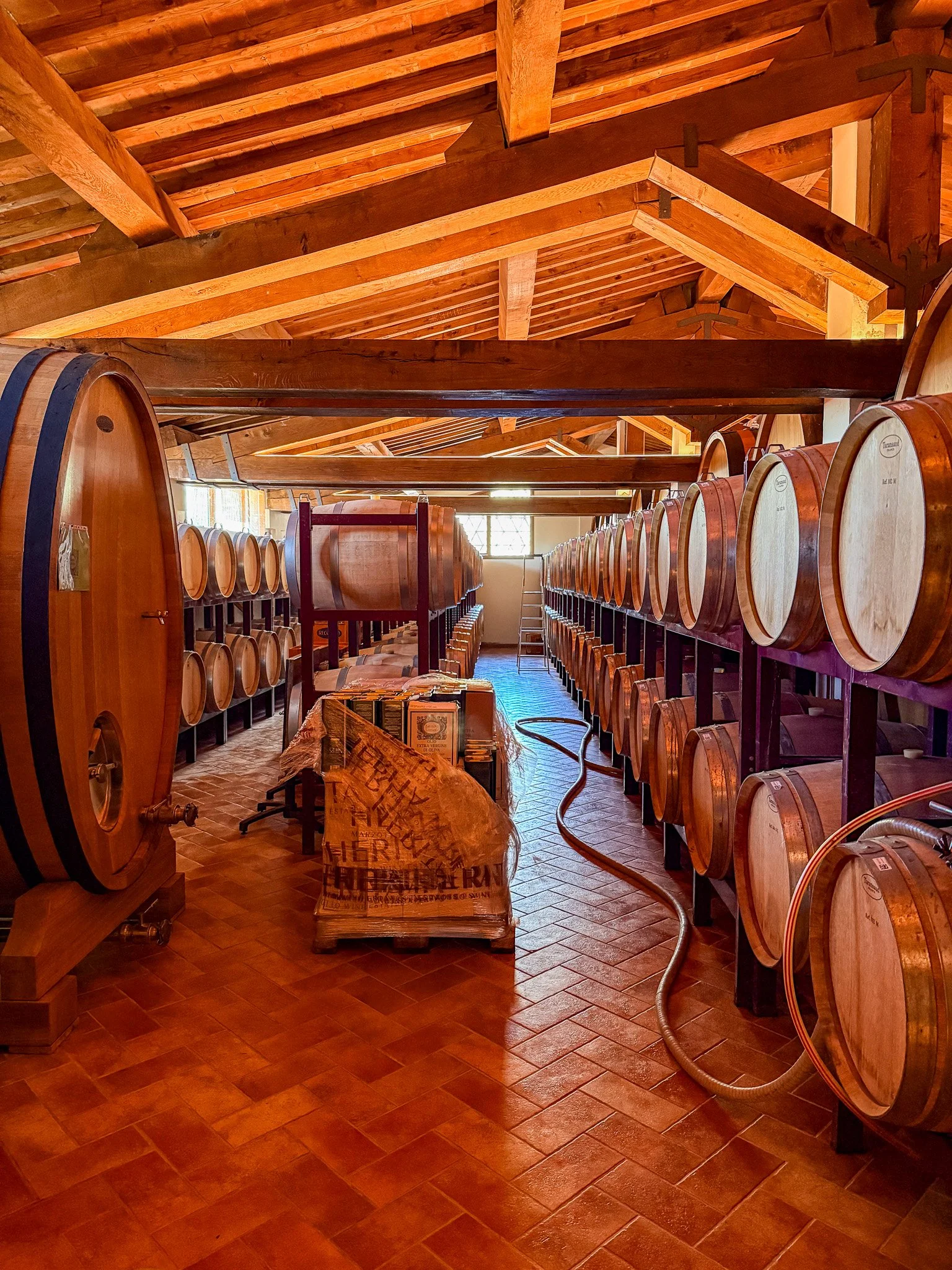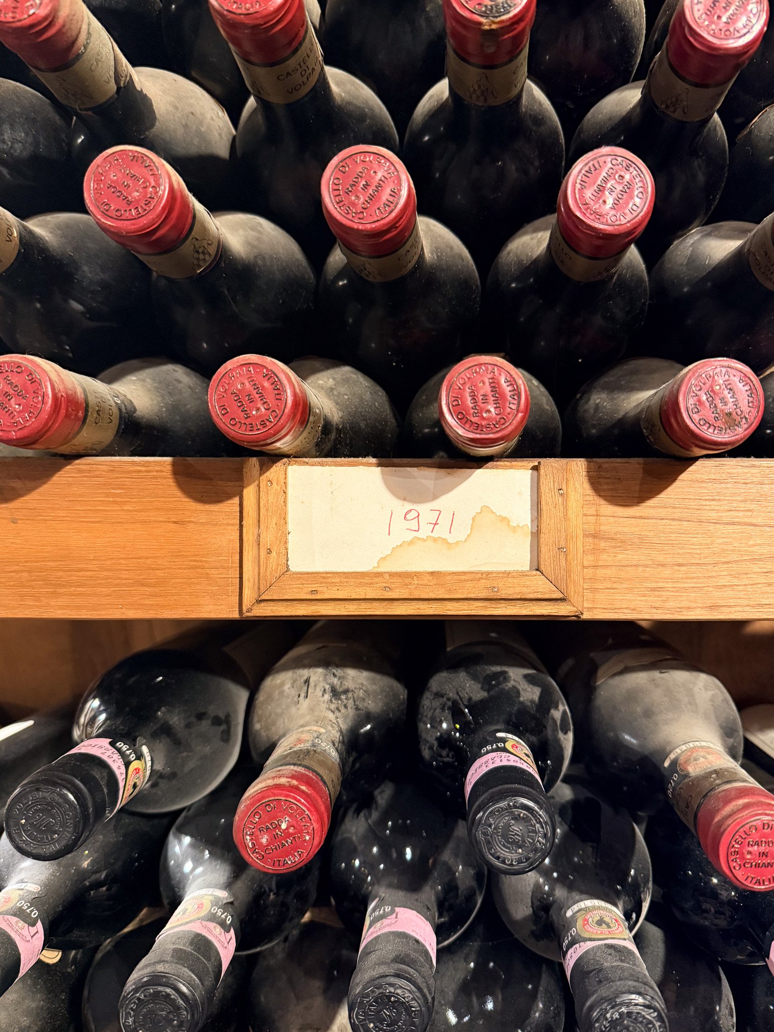 The second property we visited was Castello Volpaia in the tiny village of the same name, located in the Castelvecchi region of Chianti. The entire historic village was purchased in 1973 and converted into one giant production facility. Every building in the entire town was owned by the winery and while it maintained its historic charming 14th-century look and feel, exterior walls peeling of ochre- and Venetian red-colored paint, exposed stone, and failing shutters with missing slats, inside these buildings were state of the art winery-technology. Our guide, Francesco, would lift the metal latch on a double-size barn door and swing open the door to reveal spotlessly shiny and massive tanks of stainless steel with refrigerated jackets surrounding them keeping the wines to very specific temperatures as they aged. We went deep into the underground cellars and there we saw massive oak foudres, or 900+ liter holding tanks aging the Chianti Classico wines. We went in one building and after descending into the cellars we came out of another building. It was an incredible experience. We made our way back to the tasting room and Francesco asked us to follow him around the corner and upon some brick stairs into a tight corridor and then up some other stairs where he unlocked an ancient wooden door, revealing a room like a library. Only the shelves were full of bottles dating back into the 1950s. There was a giant oak table in the center of the room and this is where we would be tasting the wines. Again, they did not disappoint.