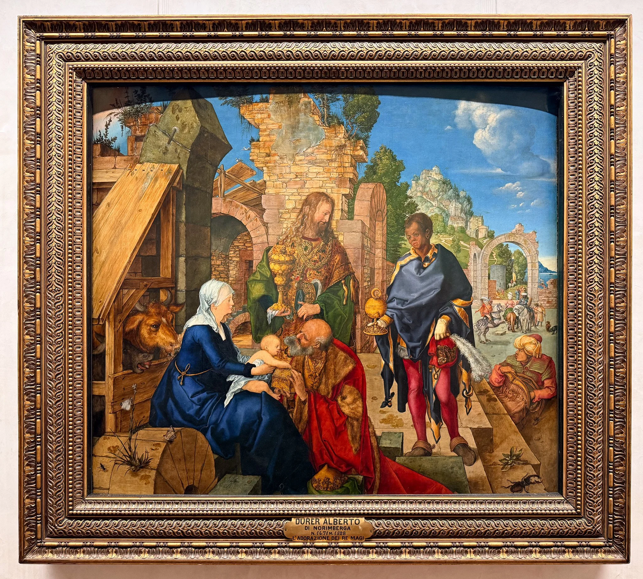 The Uffizi. Just wow. We saw Caravaggio’s Medusa Shield and his Bacchus. Botticelli’s Birth of Venus and Primavera (The Spring), Giotti, Michelangelo, Donatello, the famous double portrait of the Duke and Duchess of Urbino by Piero della Francesca, the sculpture hallway on the third floor, and the views of the city from the arcade windows. I was taken by this painting by the German artist, Albrecht Dürer, made in 1504. If you know anything about Dürer, well two things about him, it was he was insanely gifted for the times (Just look at that detail, dimension, and color) and the other was he knew it and had a serious Jesus complex because of it (That’s basically him in the painting playing the role). He also had Hollywood hair.