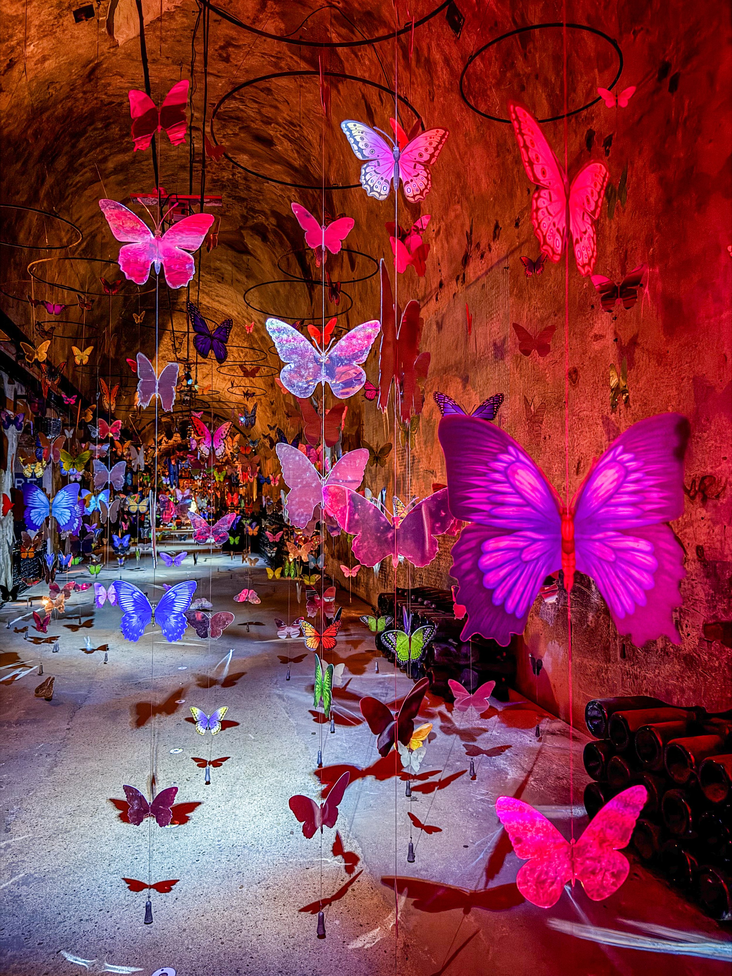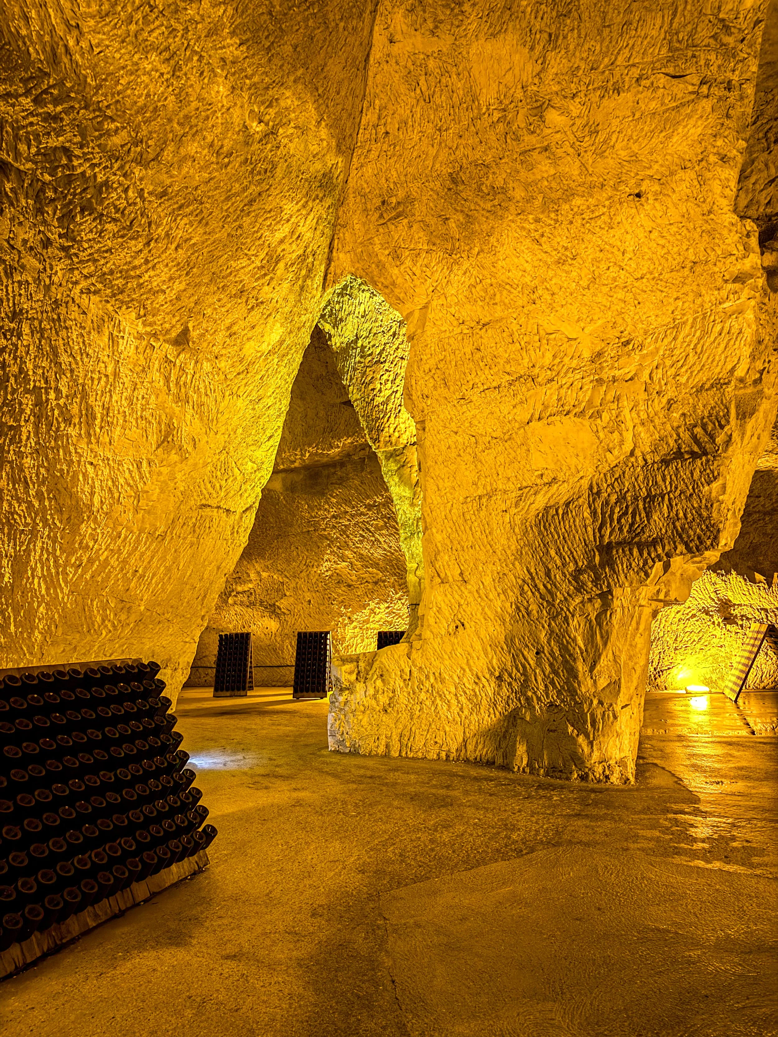 That evening we went to Domaine Vranken-Pommery and this was even more over the top. Their caves are deep underground and set up like a massive chalk cave art gallery. There were lights, atmospheric music, carvings, statues, displays of moving Wellies (boots) honoring long-gone cellar workers, which was kind of freaky the way they jumped and danced as if occupied by cellar ghosts. Oh, yes, and there were bottles of wine, but they were almost an afterthought. For me, they were just as impressive. They had mountains of large format bottles—Jeroboams (4 bottles of Champagne), Salmanazars (12 bottles of Champagne)—laying asleep since 1996 waiting for their day to shine. The cellars are so large they have street signs. They have areas carved out of the chalk filled with bottles with the names of their final destination written above in street sign paint: Tokyo, Bristol, Manchester, Barcelona, Sri Lanka, etc. Pommery exports 75% of its production. After we finished the “exhibit” and climbed the long flight of 126 stairs back to the surface of the Earth, we had a three-course dinner with Champagne pairings in their restaurant, Le Réfectoire à Reims. The highlight was their Grand Cru Royal 2015, an obscenely expensive Champagne that I was happy to be able to experience but would not ever be buying unless my financial picture changes for the better.